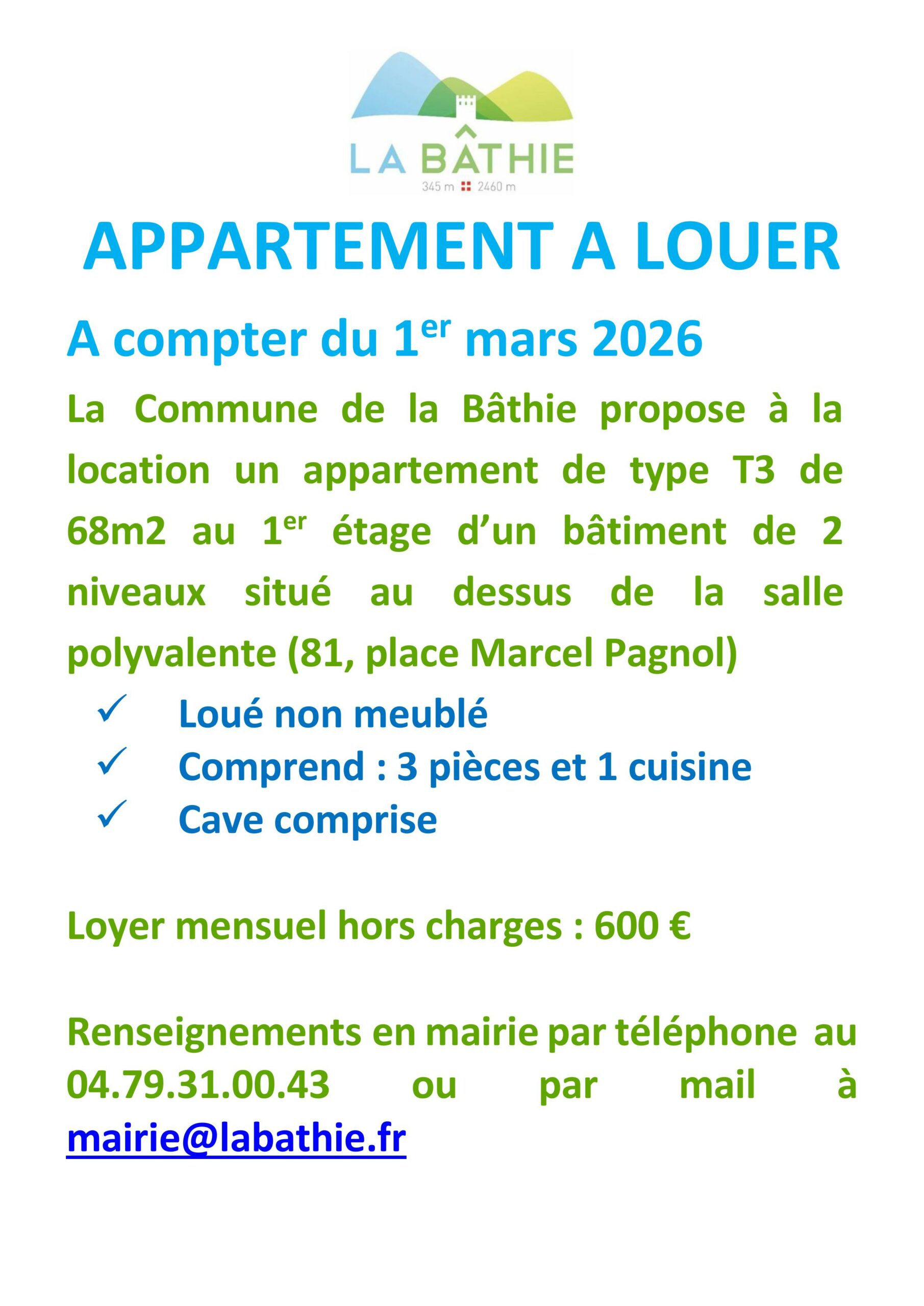 La Commune de La Bâthie propose à la location un appartement T3 de 68m2 au 1ère étage d’un bâtiment de 2 niveaux au dessus de la salle polyvalente.